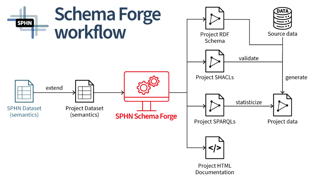 Today, we take it one step further and present a tool that automates the whole process. The SPHN Schema Forge is a web service that significantly facilitates the work of SPHN projects to generate RDF schemas and related components (SHACL rules, SPARQL queries, pyLODE HTML visualization). It automatically creates the above cited elements by only taking as input an Excel file, compliant with the SPHN Dataset. It integrates the majority of tools developed at the DCC such as the brand new Dataset2RDF, the SHACLer, the SPARQLer and the SPHN Schema Visualization Tool.