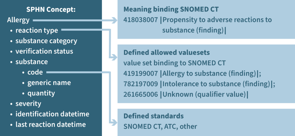 To make the SPHN concepts comparable nationally and internationally, we express their meaning using existing semantic standards (controlled vocabularies), by creating a meaning binding wherever possible to SNOMED CT and/or LOINC. The data element of a concept can be expressed using one or several recommended standards (e.g. LOINC, SNOMED-CT, ICD-10, ICD-O-3, CHOP, ATC). For example, the instance of substance code under the concept “allergy” can be an ATC code, a SNOMED CT code, or a code form another semantic standard. If needed value sets are defined and if possible, a value set binding to SNOMED CT is added. Descriptions for concepts and value sets as well as standards are, whenever possible, aligned with national and international sources.