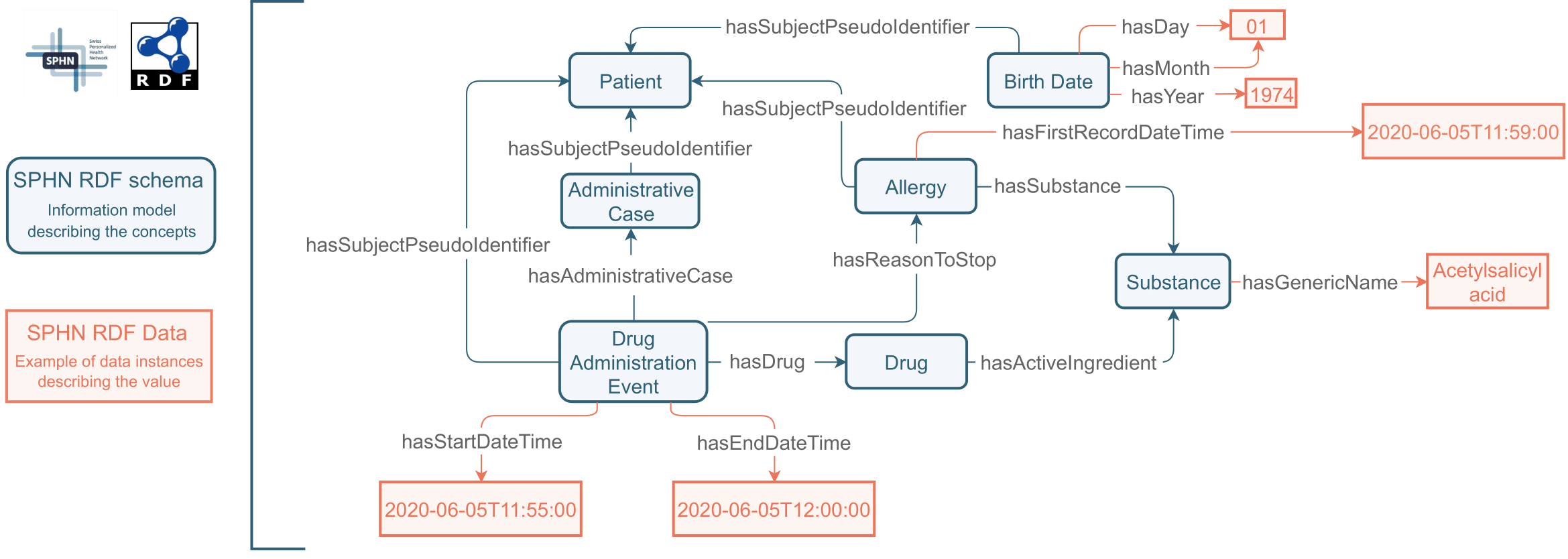 The relations between different concepts and the data are expressed in the form of triples composed of a “subject”, a “predicate”, and an “object”. The example shows a patient born on the 1st of January 1974 which has an Administrative Case registered with a Drug Administration Event. During this administration, a Drug was given to the patient on the 05.06.2020 at 11:55. The Substance administered was 'Acetylsalicyl acid'. The Drug Administration Event has stopped five minutes later, at 12:00 for the reason that an Allergy was observed at 11:59 to that Substance. RDF is quite flexible and enable us to make use of different existing semantic standards, and value sets as defined in the SPHN Dataset.