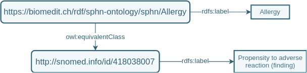 In RDF subjects, predicates and (sometimes) objects have a Unique Resource Identifier (URI) that enables the unique identification of these elements. In our example, the concept Allergy has the URI https://www.biomedit.ch/rdf/sphn-schema/sphn#Allergy , which uniquely and unambiguously identifies it in the context of SPHN. The SNOMED CT meaning binding to the equivalent meaning of ‘Allergy’ is introduced by linking the URI of the SPHN Allergy class to the corresponding URI in SNOMED CT (http://snomed.info/id/418038007) in the SPHN RDF schema.
